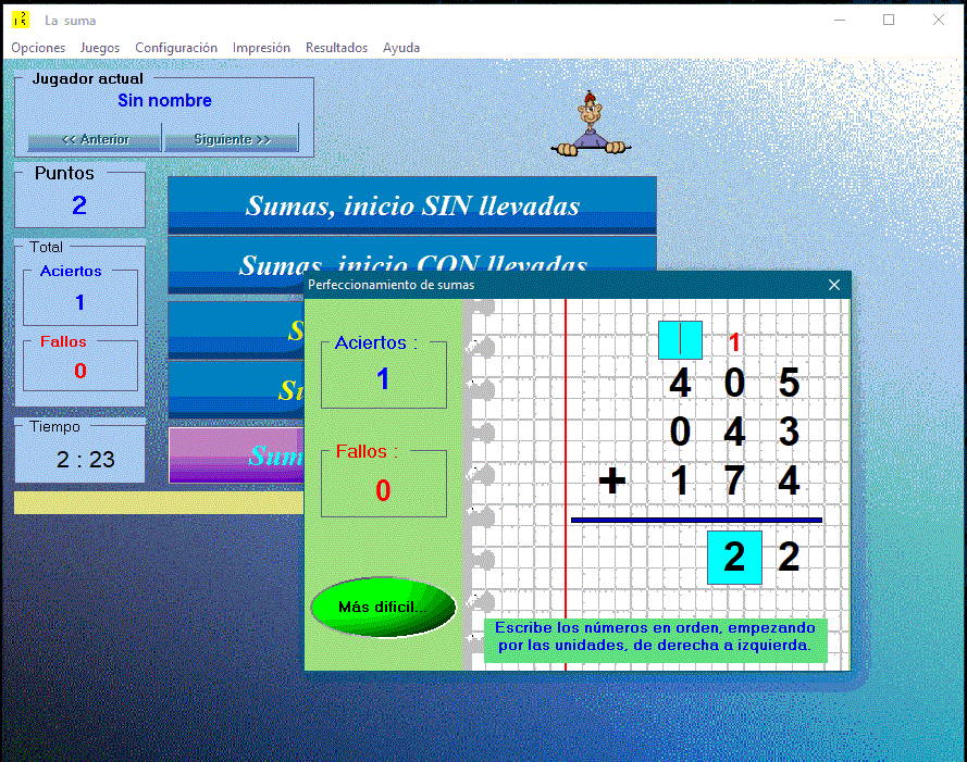 It greatly facilitates the practice and completion of addition and subtraction, since it introduces the operations to the students in an entertaining way and the program makes the correction, without the need for the intervention of the educator. It also allows the student to adapt, since it has several game options to make and combine additions and subtractions without carrying, with carrying, with several columns, with several rows,...