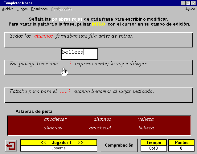 Tiene varias opciones para jugar a completar una frase, dos frases, tres frases o cuatro frases. En la opción para completar 1 frase, la frase aparece con dos huecos para completar.