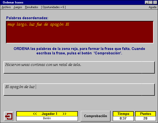 El juego permite establecer el número de oportunidades o intentos disponibles para ordenar correctamente cada frase.