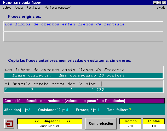 Al escribir las frases, el programa hace una corrección de la misma, marcando con distintos signos los errores, debajo de los caracteres.